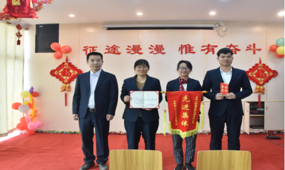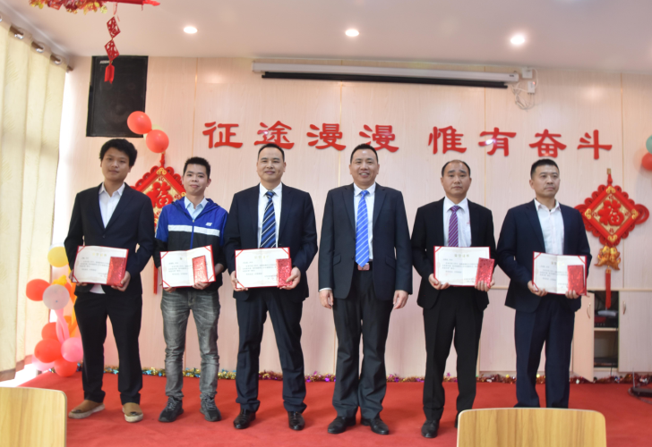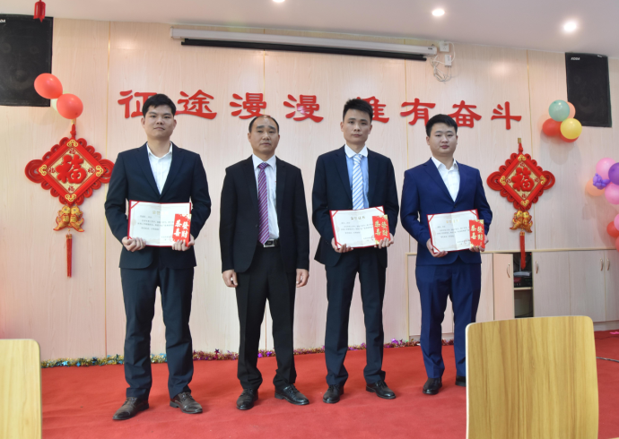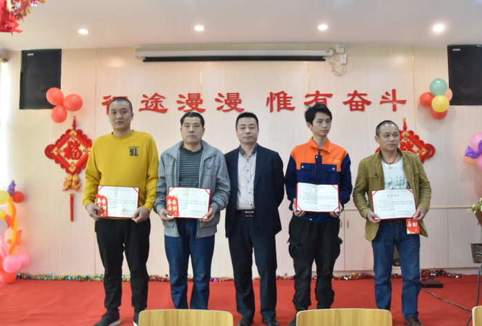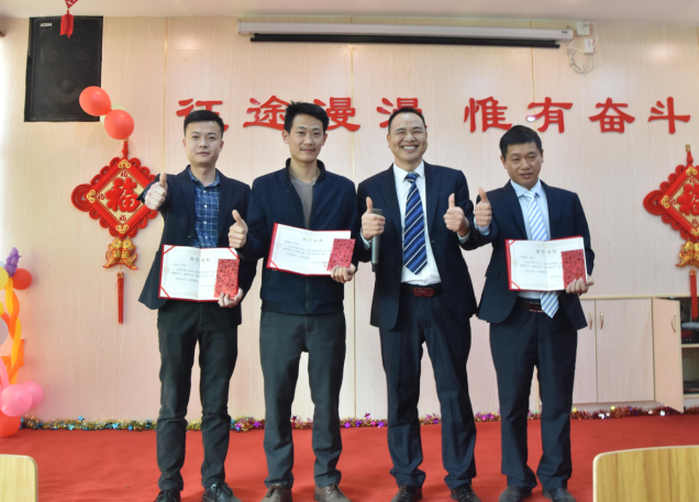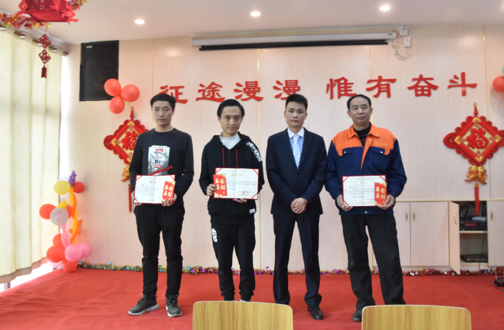 生產(chǎn)部經(jīng)理廖小強為伍志強、柳敏捷、戴剛、韋進(jìn)勇頒發(fā)先進(jìn)個人獎