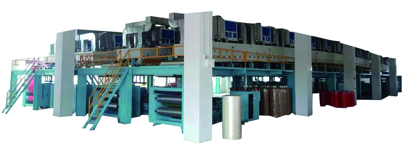 將成卷的基材,如:紙張、布匹、皮革、鋁箔、塑料薄膜等,涂上一層特定功能的膠、涂料或油墨等,并烘干后收卷。