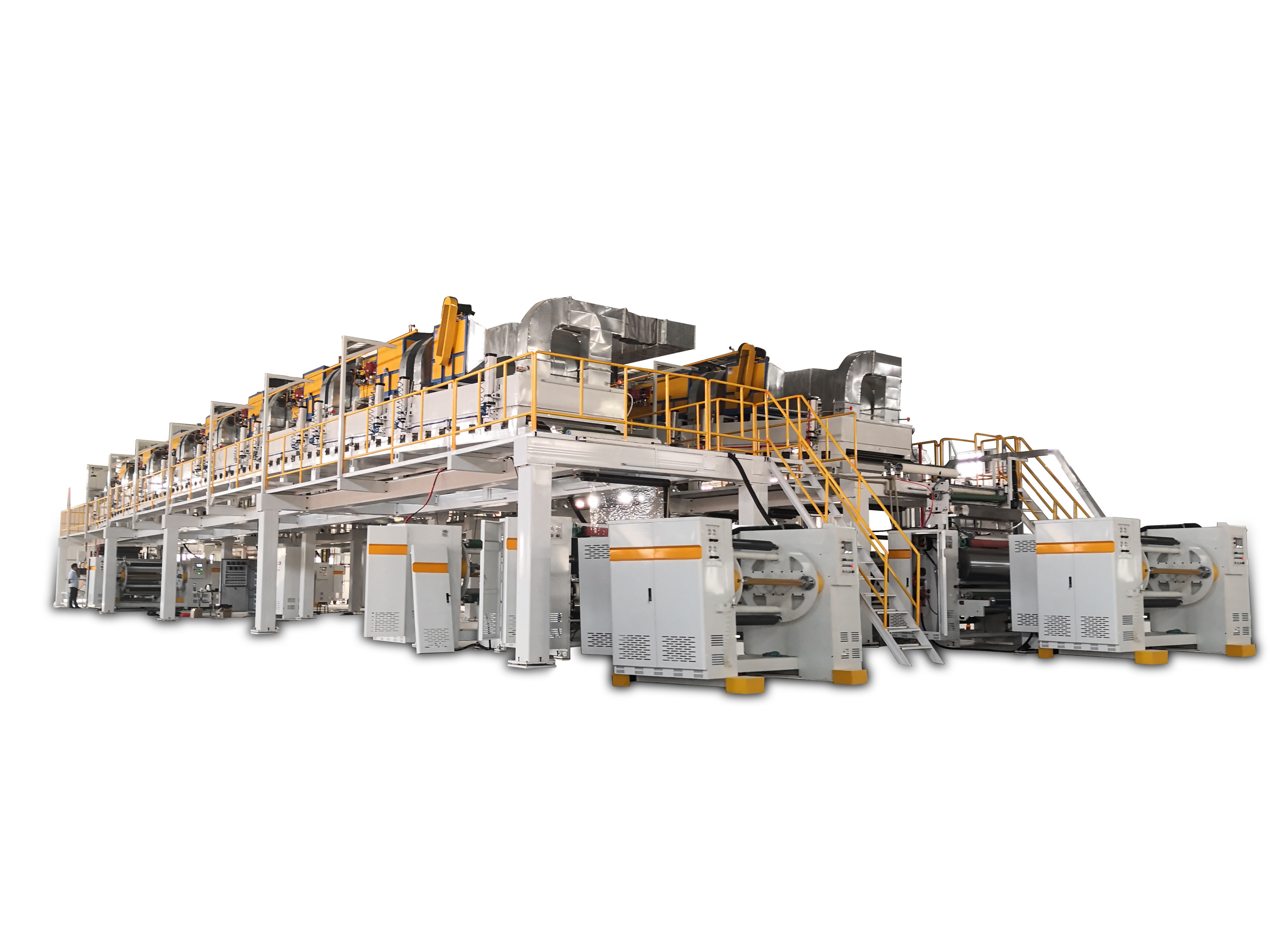 雙面涂布機采用矢量變頻無級調(diào)速大滾筒、牽引輥與網(wǎng)紋輥同步調(diào)速;網(wǎng)紋輥帶刮刀涂布方式,備有多種涂布量的網(wǎng)紋輥供選擇;移動式刮刀裝置;采用分段獨立恒溫半導(dǎo)體不銹鋼發(fā)熱管導(dǎo)熱油交換器加熱風(fēng)干燥系統(tǒng),可調(diào)式內(nèi)循環(huán)吸排氣裝置;烘箱內(nèi)導(dǎo)輥同主軸同步轉(zhuǎn)動,開門式烘箱及穿膜操作平臺;網(wǎng)紋輥、牽引壓輥由氣動電磁閥控制;自動計米裝置;收放卷軸采用鍵子式氣脹軸裝置,裝卸料操作方便;整機采用PLC電腦系統(tǒng)自動控制張力。
